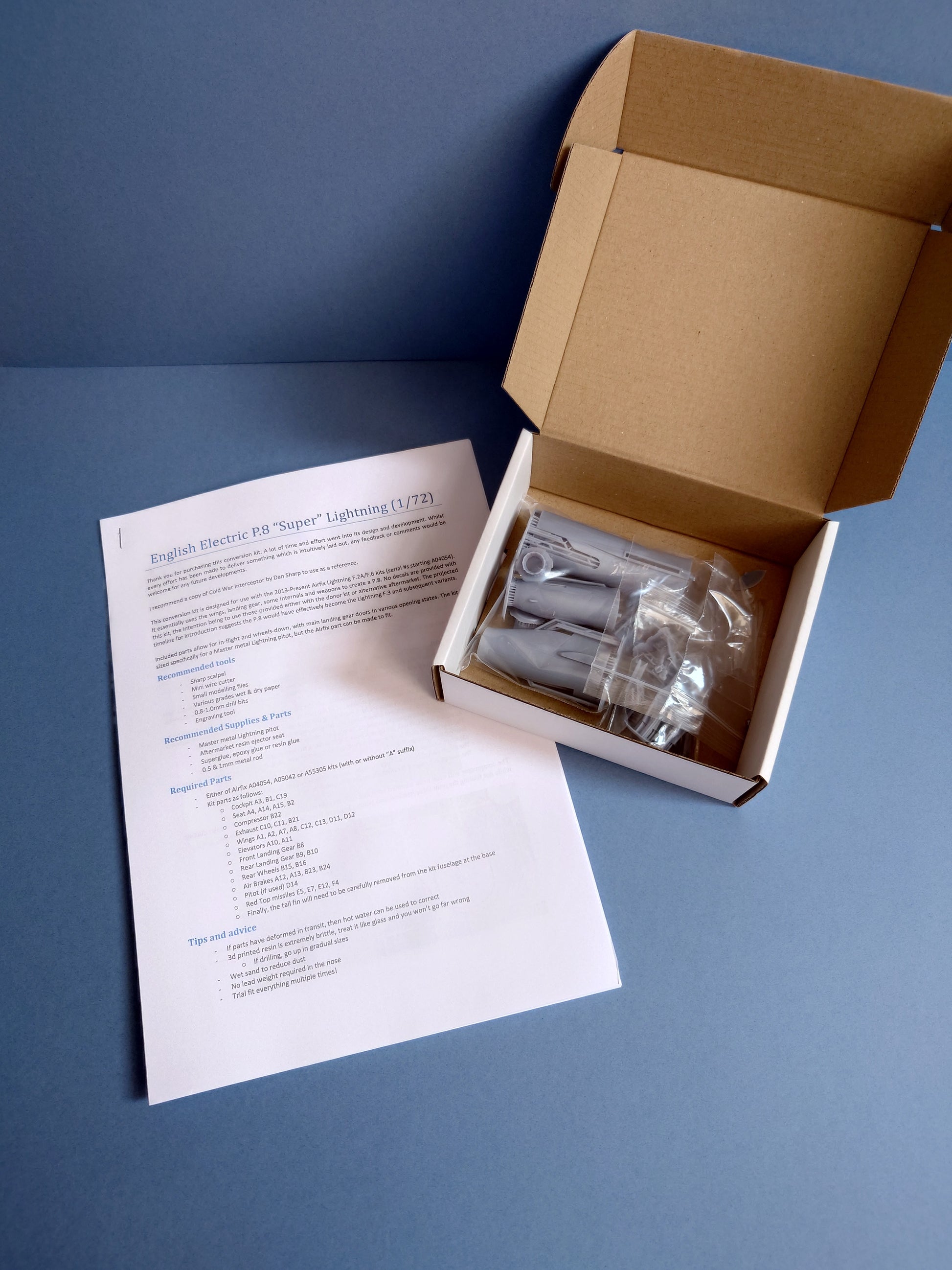 A kit to convert an English Electric Lightning into the P.8 "Super Lightning" design submission for Operational Requirement F.155T. Consists of 3d printed parts, 2x vacuum formed canopies, and a metal pitot to convert any of the following Airfix kits: